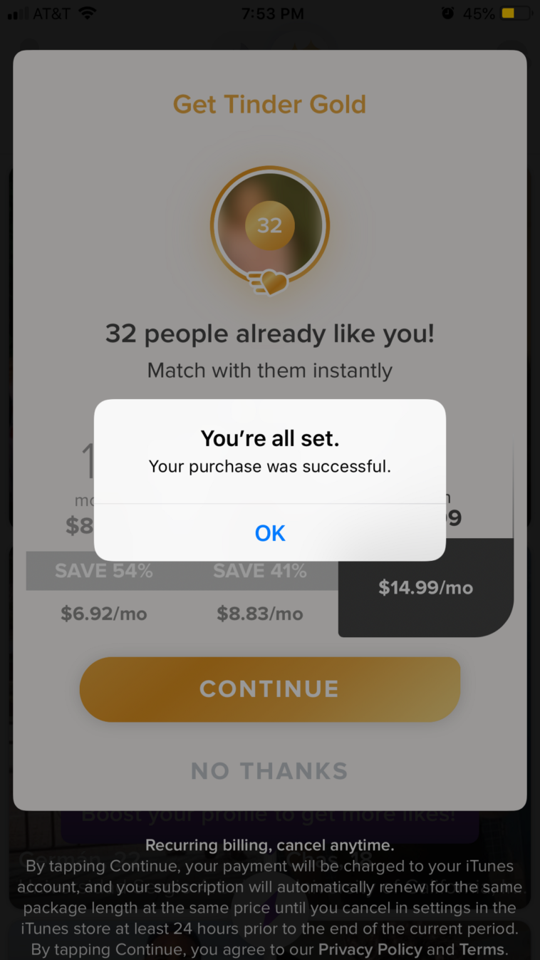 It should be noted that I’ve yet to use any of my Super Likes, or even my Boost yet; I’ll probably save it for a serious time when I feel inclined to not sign up with Tinder Gold anymore, or if I’m going to close my account for good. When that happens, I’ll swipe right on every single profile that I see within a fairly close radius and go for any last minute numbers.