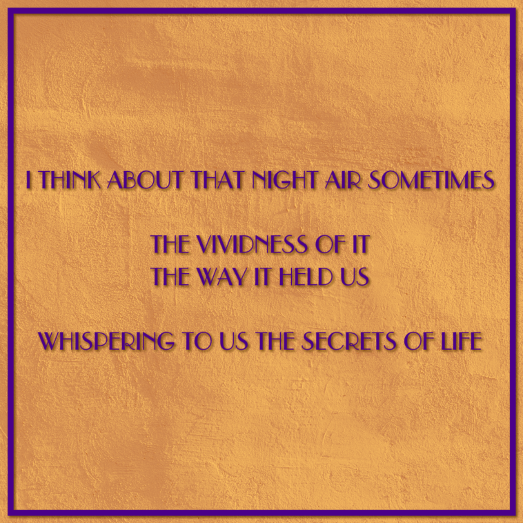 The noise of our laughter and pent up profanities was swallowed by the warm, yet cool, night air rushing over us. You were playing songs from a speaker you had brought along with us. I loved that you knew to bring it, we spoke the same language. The music you played was weird though, the kind only artists like. A series of ambient electric noises. But it worked. We vibed.