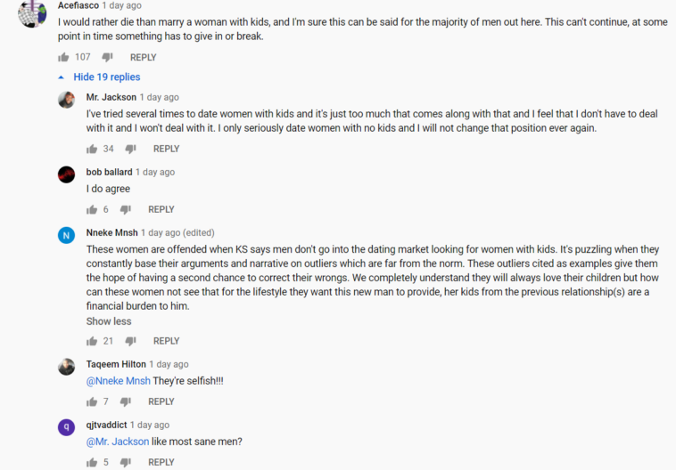 I would rather die than marry a woman with kids, and I’m sure this can be said for the majority of men out here. This can’t continue, at some point in time something has to give in or break.”
