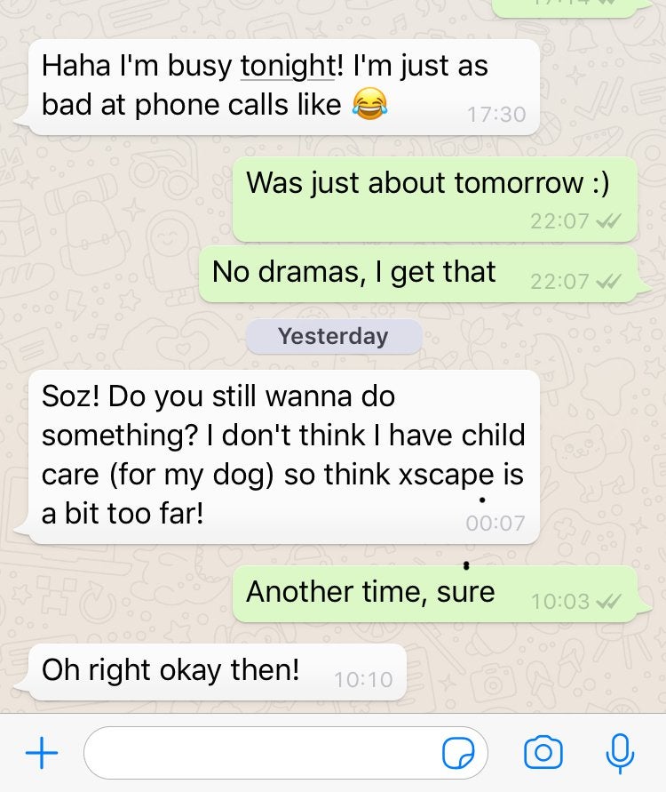 OK. We match on Tinder, text every other day – good for a couple hours, fizzles out. I text again after a couple days.