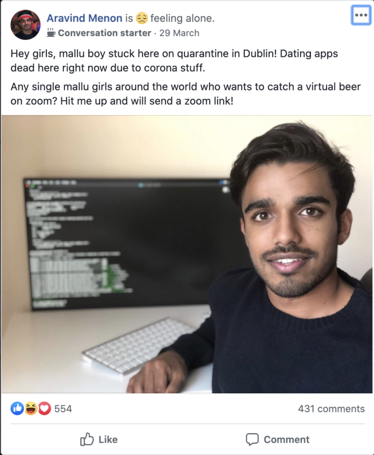 Two weeks into my Irish quarantine, I was in a bantery mood and posted this (see picture) on my favorite facebook group, Subtle Mallu Traits. The response I got was staggering: 431 comments — dozens of guys called me “kozhi” countered by some lovely messages from women. And some of them even hopped on a zoom call with me!