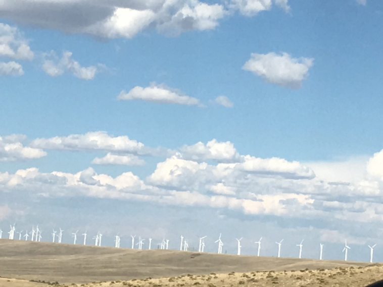 Jane took pictures from the moving truck of the vast fields of wind turbines in Rock River. Her screen showed a row of bright white stick figures doing calisthenics in a distant line.