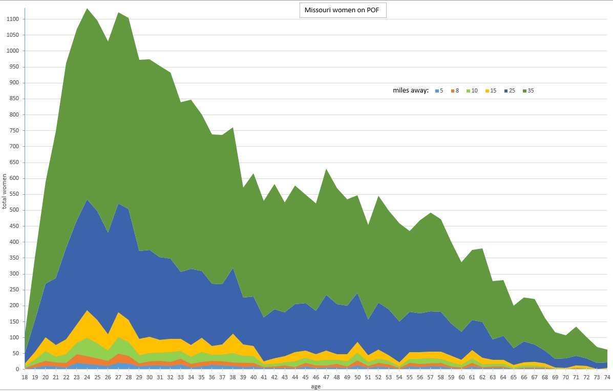 I did over 300 searches (and had to change my age a few times since POF limits the age range to +/- 14 years) to generate this graph. Maybe someone else might find it interesting or learn something from it. In my case, if I were to desire a 41 year old woman who lives nearby I’d probably be disappointed since there’s so few of them. Also, ages 23-31 on this graph should probably be even higher, but POF only shows « 600+ » when there’s more than 600 results.