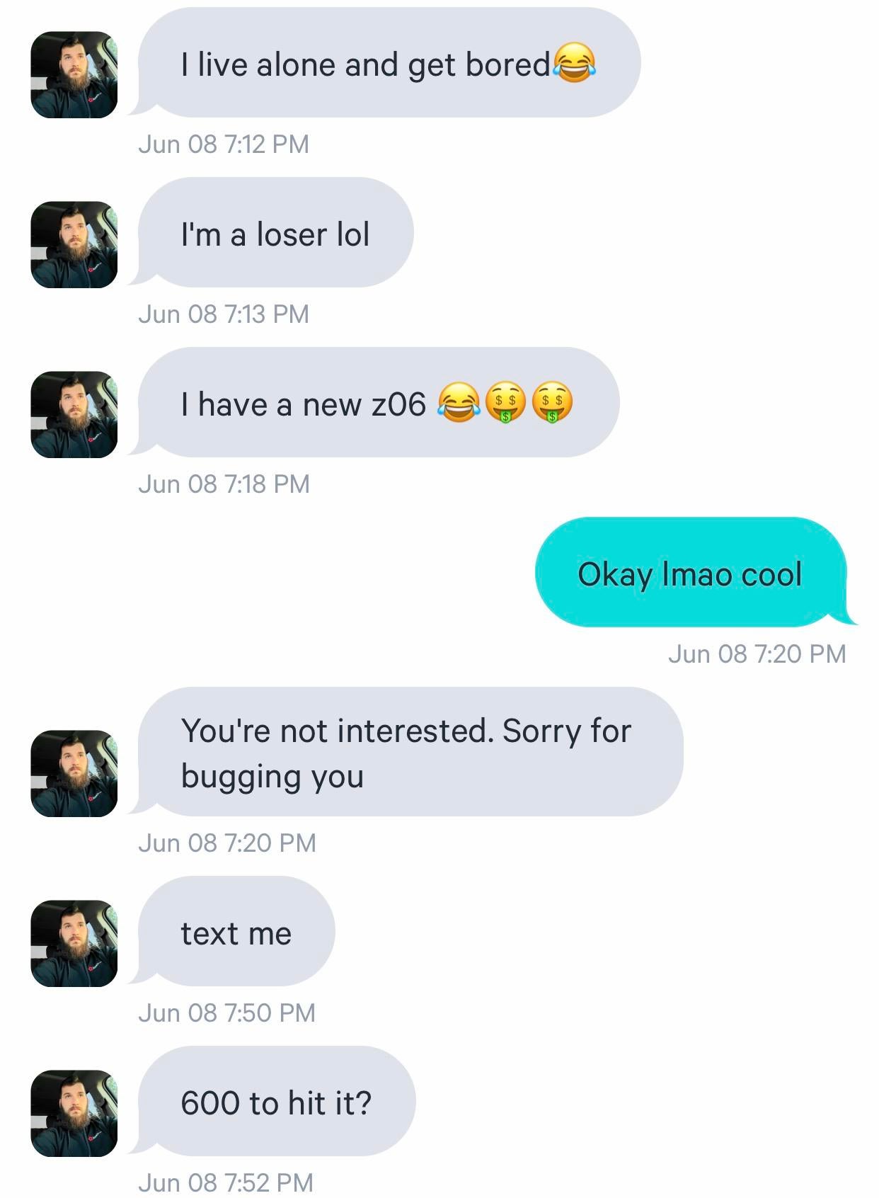 1. What a roller coaster: sadness, self-pity, bragging, apologizing and begging, ending with the implication that you’re possibly a prostitute. Bravo.
