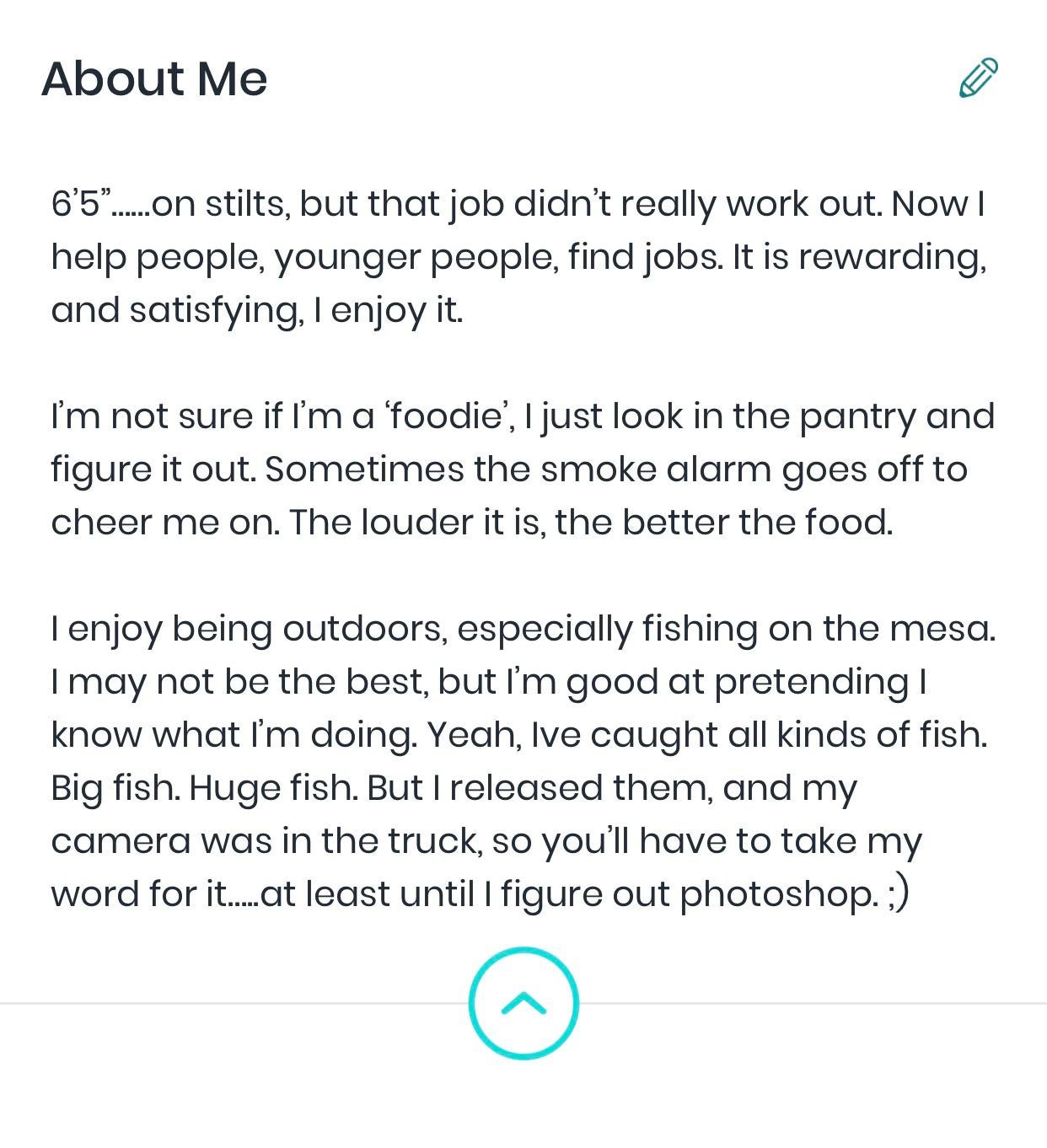 That’s a great profile. Light hearted with some good conversational springboards. I personally find few people read them, but take every advantage you can get.