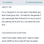 To be fair, I have my standard bio saved as a note on my phone, so I don’t think this is an odd request. I also save my opener message and standard answers to questions I always ask during the “getting know you” stage. It gets tiring repeating the same thing over and over again for each new person. It helps with the fatigue and lets you focus more on the person you’re talking to versus the annoyance of retyping the same small talk.