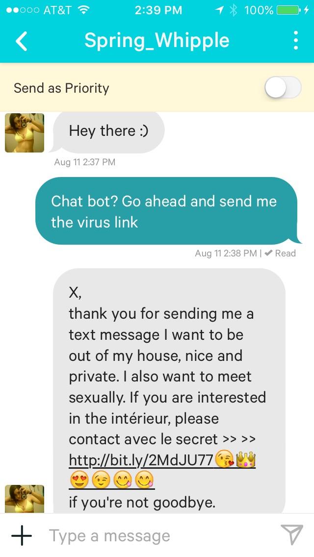 it’s starting to get a lot easier now to distinguish the bots. They’re putting up pictures with an age that doesn’t match, having one line about me sections that are either « write me and you’ll know everything, to go a bike ride » or something else similarly stupid, and there’s numbers in their user ID….for example, Bailey_bera4d63. Kinda makes her sound like a MAC address.