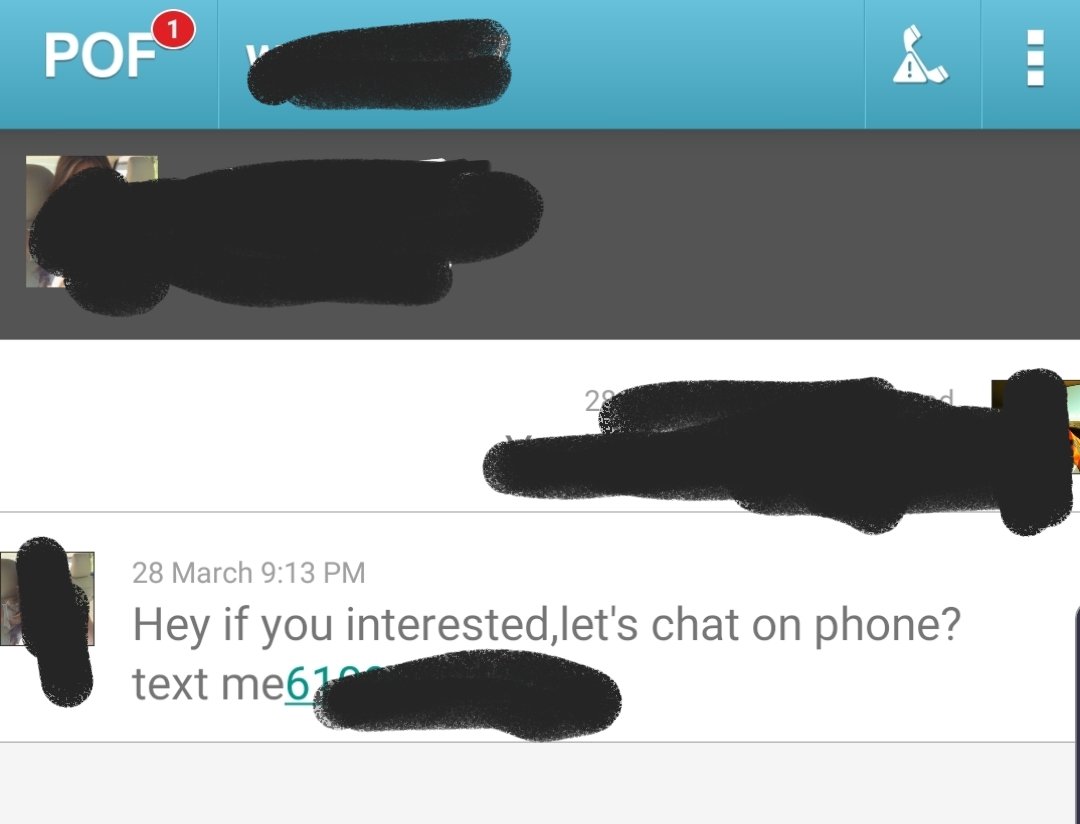 POF : Are messages like these fake profiles? I seem to be getting tons of them where their first messages back are telling me to text or call them… 🤔