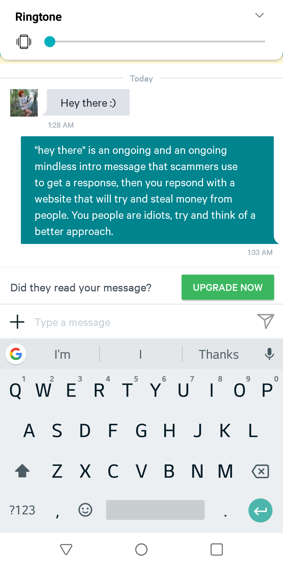 2. I either get THIS or someone saying something like « Hey dear…How are you doing? », which usually gets followed by a message of a fake number to text. I swear, EVERY message I’ve gotten this entire month has been either the « Hey there 🙂 » or « Hey dear… » message.