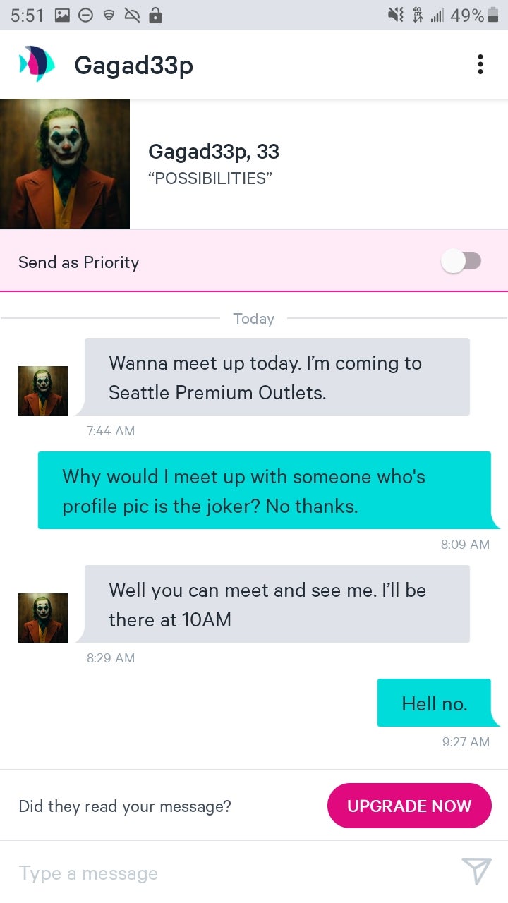 So he was being polite and nice and you immediately came off as a bitch to him. And even after you insulted him he was still nice. Was you really expecting people to take your side on this? You handled this poorly and your emoji laughing makes you come off as very immature. Maybe thats why you’re still on the app? Cause you act like a snotty kid?