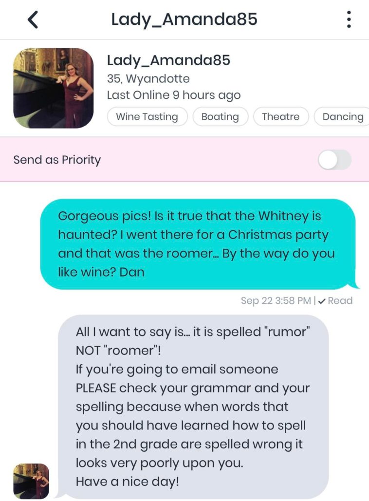 But, supposing if you had spelled rumor correctly and she would have messaged you back with a positive message, I’m thinking eventually you would have started to realize she’s an overly critical person. Better to get it out of the way immediately!