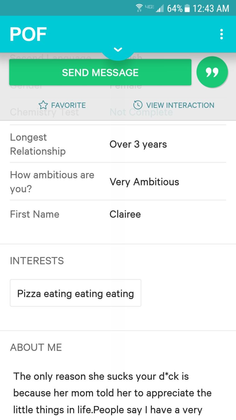 POF : Bot account had a pretty funny first line of a bio. If they wrote the right colored hair and eyes, I would have thought it was a real person.