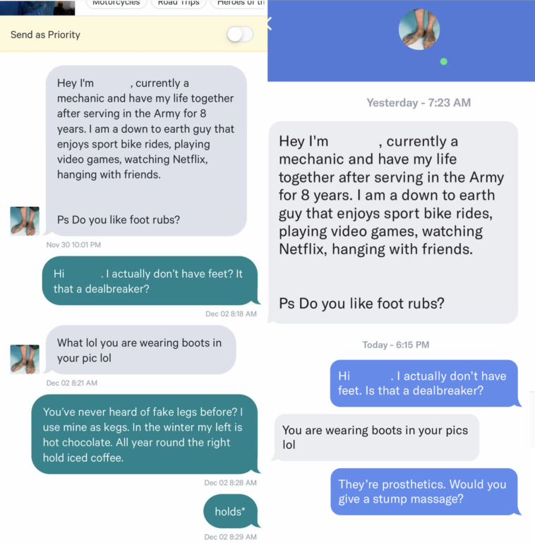 Guy hits me up with a copy and paste on two different apps starting off with his fetish. Trolling ensues. I responded the way I did because it was evident from his profile he didn’t read mine before messaging (he wouldn’t have bothered if he did ~ fundamentally incompatible). Old screenshots BTW.