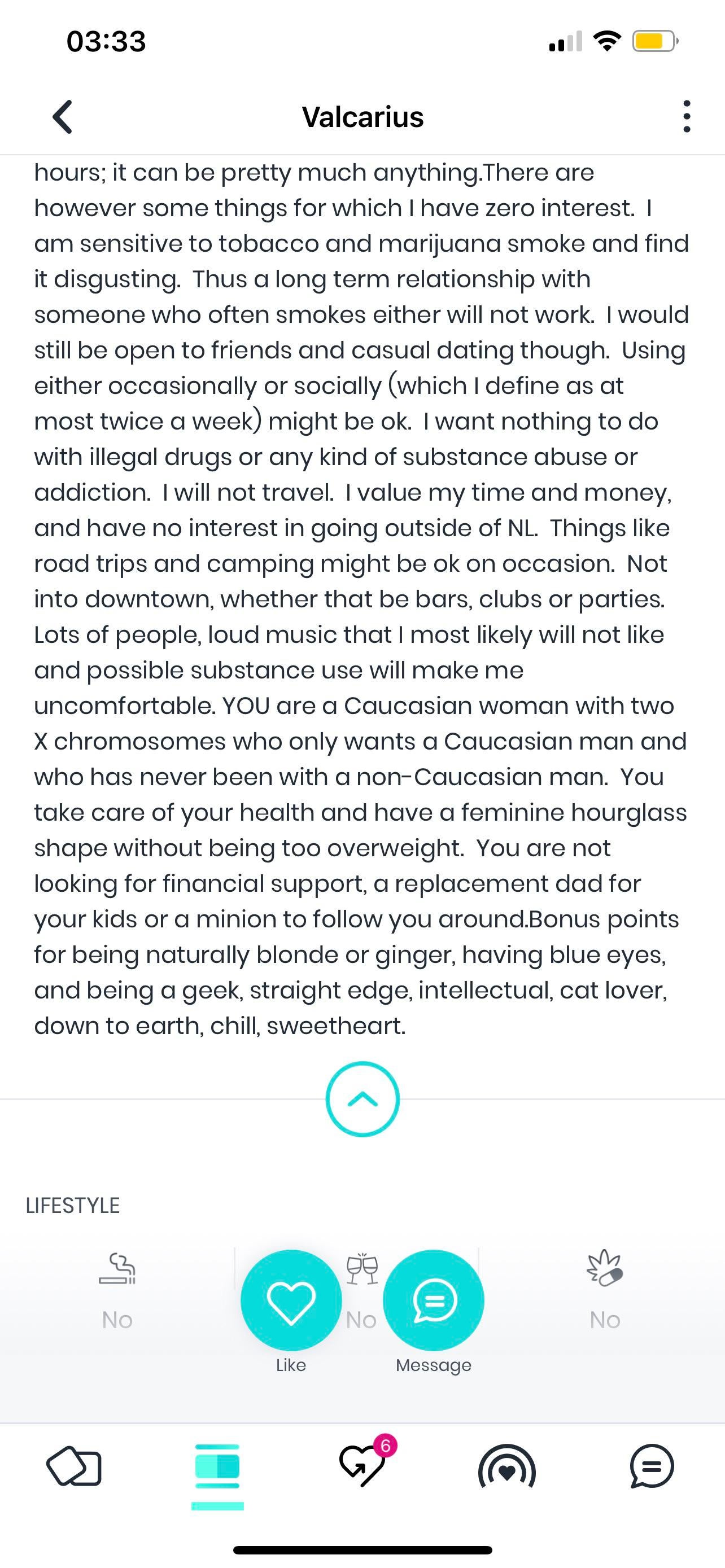 Woof. So many red flags are revealed here. For the record, some of these are perfectly fine preferences, but there’s a little thing called tact. But the part about skin color, yikes.