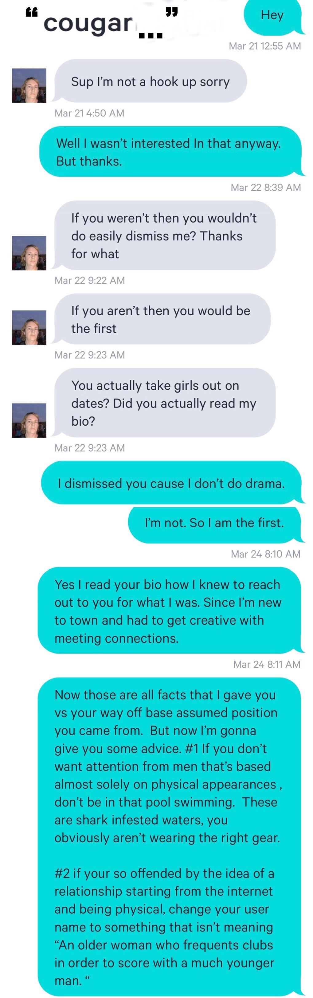 POF : I’m so glad this reddit page exists. Cause this is pure gold. Well just call her “cougarkitty” for now. Cougarkitty and I have a shared hobby and I wanted some local insight as a new guy in town. Side note : I’ve never dated someone over 30 or white.