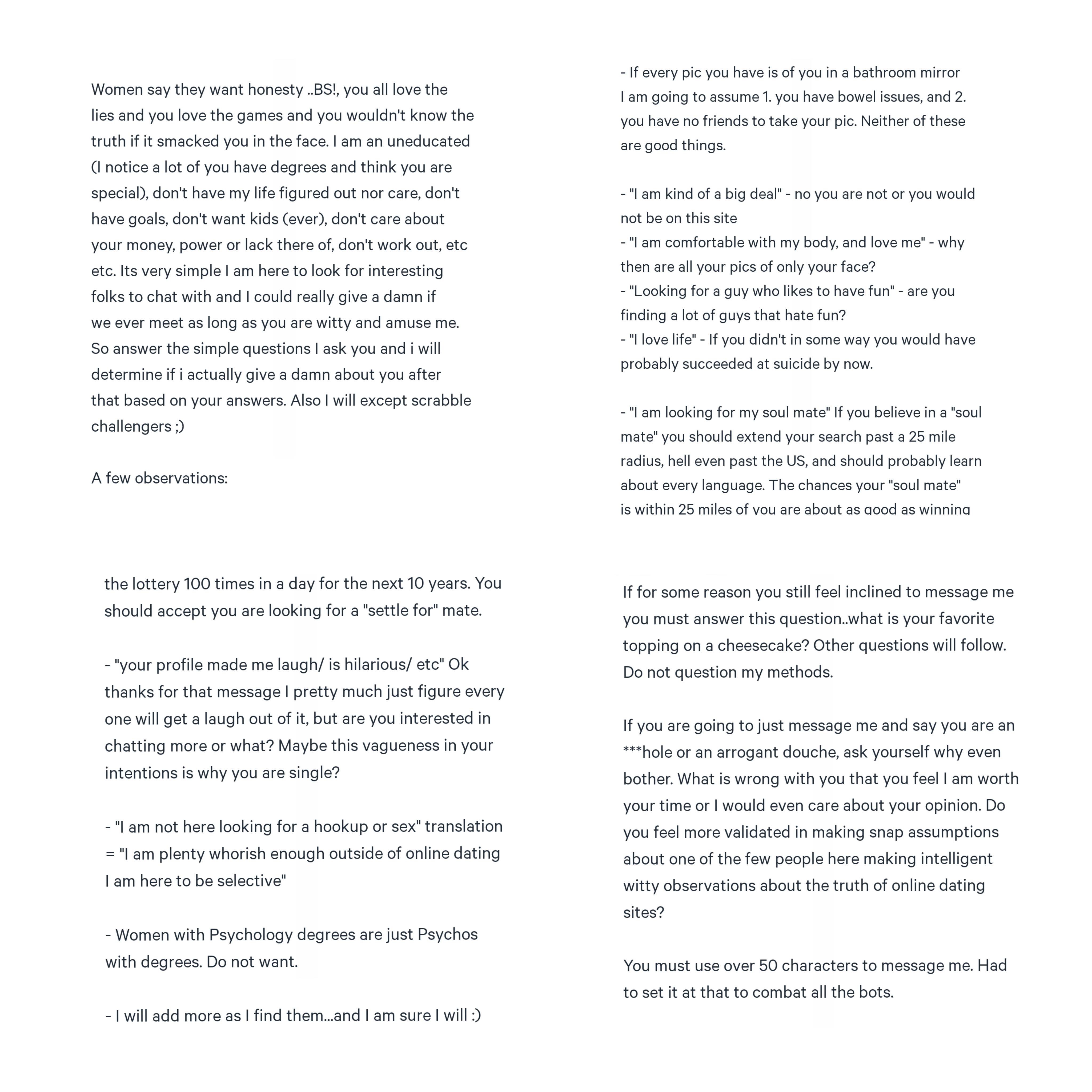 I find fault in some of his assumptions based on my own personal beliefs but he has a right to make them. I don’t think having a psychology degree (or any degree) should make you better or worse than another but it does come with its own prestige stigma. I also ask for no hook ups or be a side piece because that seems to be what the app has fallen too and the assumption if you are on it that is your end goal. I don’t have side action or FWB because I know my worth and what I’m willing to settle for in a relationship.