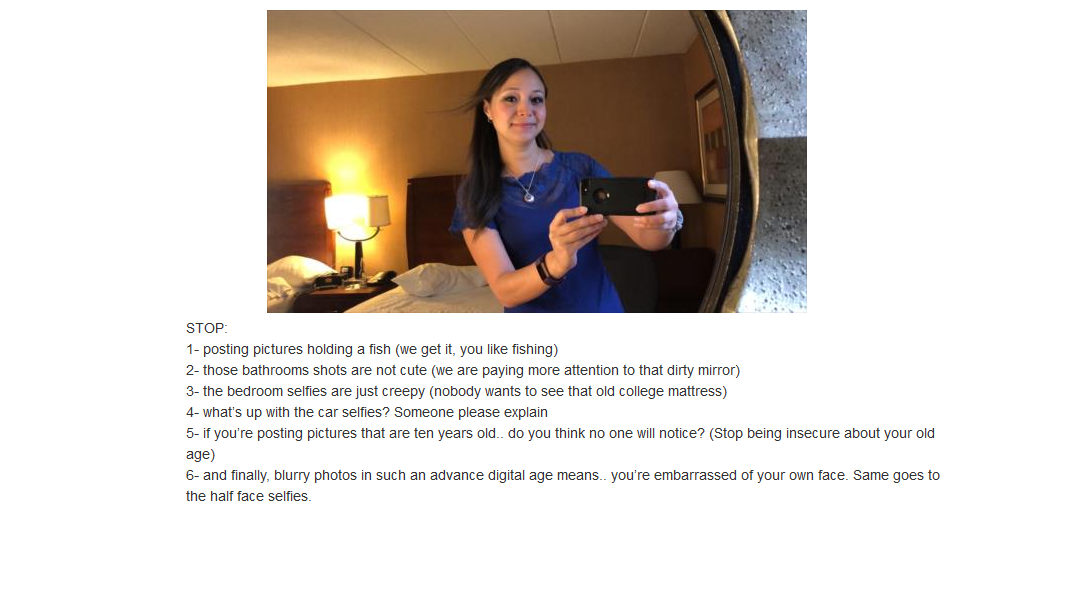 And for the love of everything sane, quit putting filters on your photos. That « skin smoothing » stuff is clearly obviously fake and makes me wonder what you’re hiding. And no snapchat frames and crap. If i wanted a puppy, I’d go to the pound.