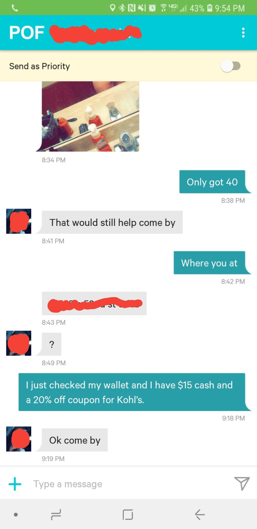 So it’s obvious that POF is full of bots or girls trying to sell themselves. Landed the second type yesterday and decided to have fun. She said she’d give it up for $60. I told her $40 thinking she’d say no. After she was cool with it, I went super ridiculous. Evidently she must be super desperate or loves Kohls.