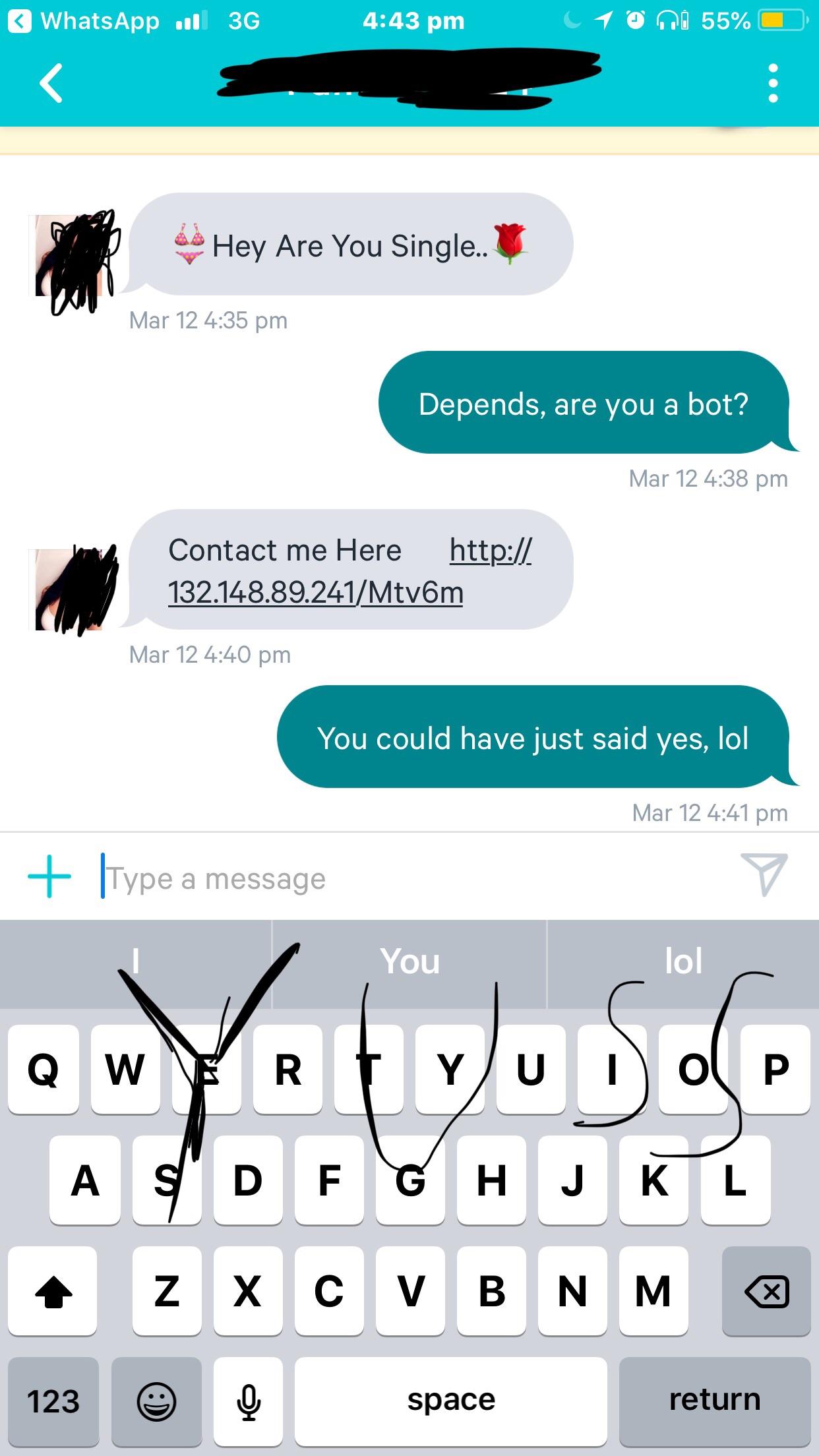 So I got that message 3 times, 2 of them were bots, the other time may have been a legit person but was a pretty basic white girl as i effortlessly just said ‘yes’ and 2 minutes later she deleted the conversation. she was blonde too