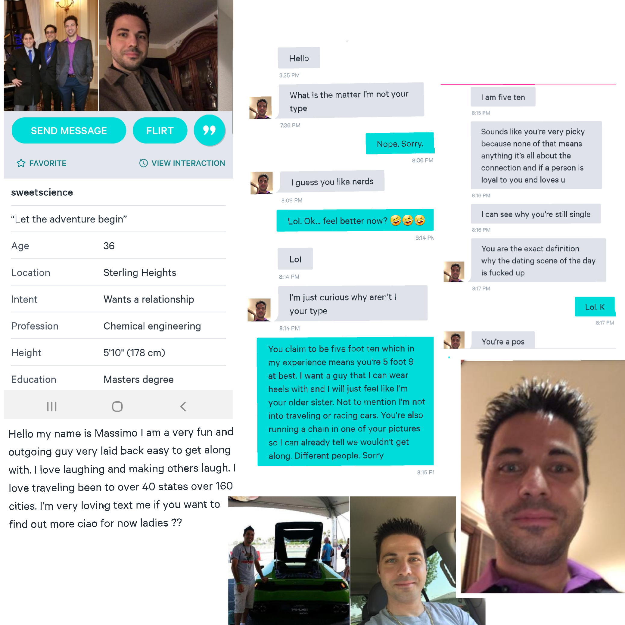 Massimo Sgambellone has some issues. My profile says I’m 5.8 and want a guy I can wear heals with, after being with a guy who was 5.6 for 6 years, I just know what I want. Same as how he probably wouldnt like me if I was 300lbs. I’m not asking for a 10/10 rich guy…just someone 4 inches taller. Lol