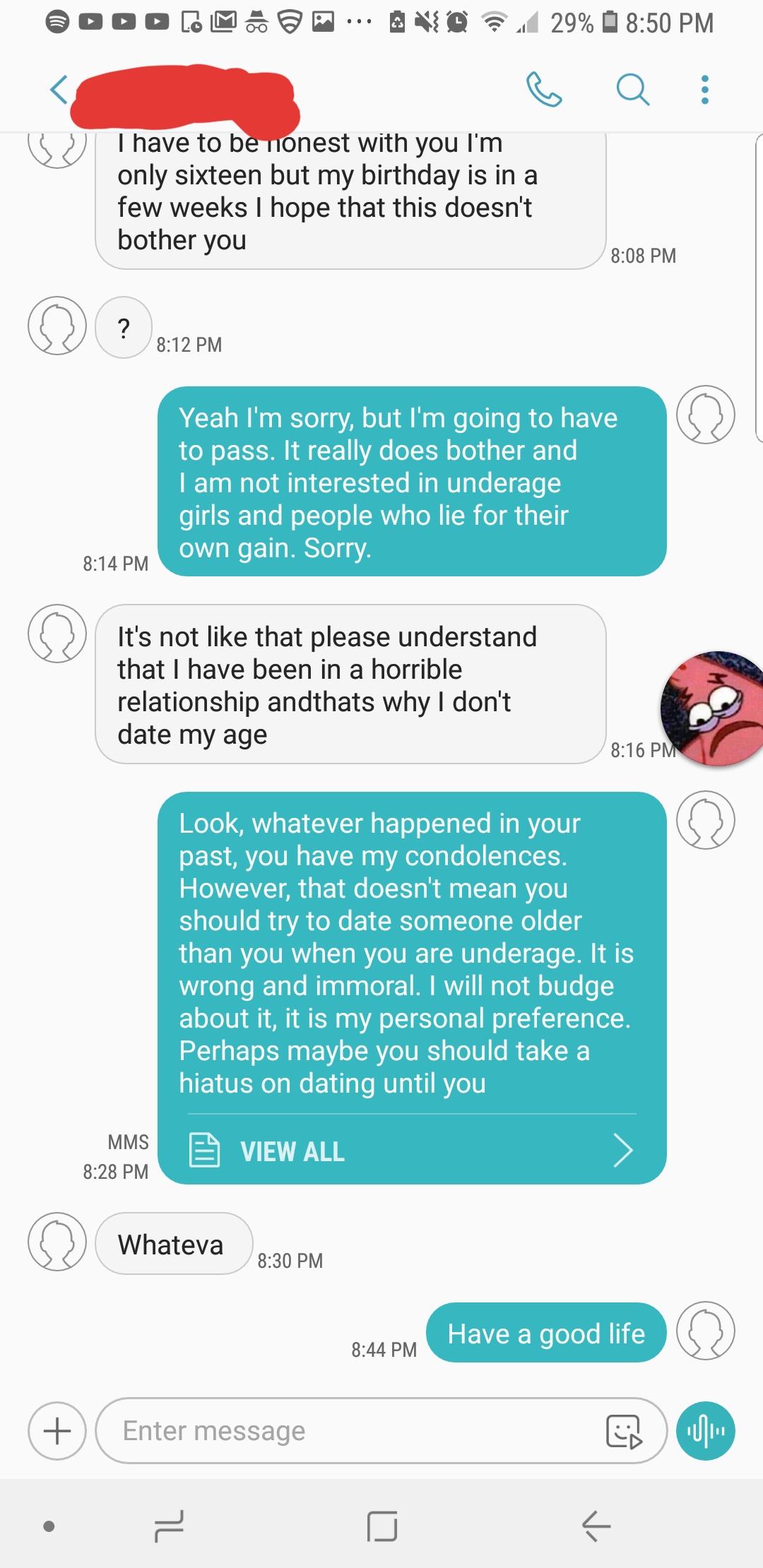 Matched with a girl on POF, gave her my number, and found out she’s underage.