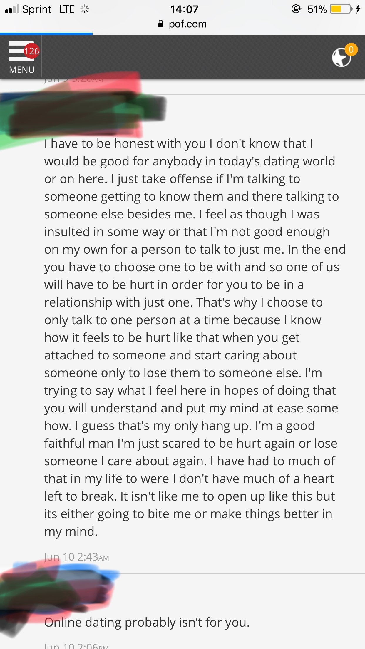 Long story short… we started talking yesterday and he doesn’t want me to talk to multiple people online. He wants me to put his “mind at ease.”