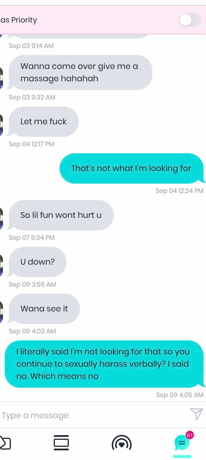 Because I just wait for them to incriminate themselves with continued harassment such as this so I can report them. And what’s funny is I usually find them on another dating app where they don’t recognize me because they probably do this to every girl until they find someone who’s willing to just want to have sex, and I’ll report them on that app too.