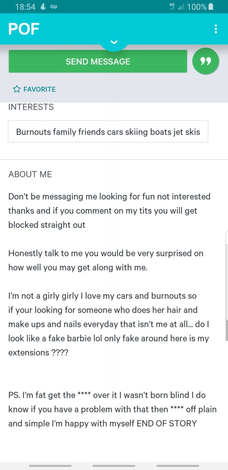 POF : *Posts 9 pictures of nothing but cleavage, duckface and Snapchat filters with MySpace angle instead of interests*