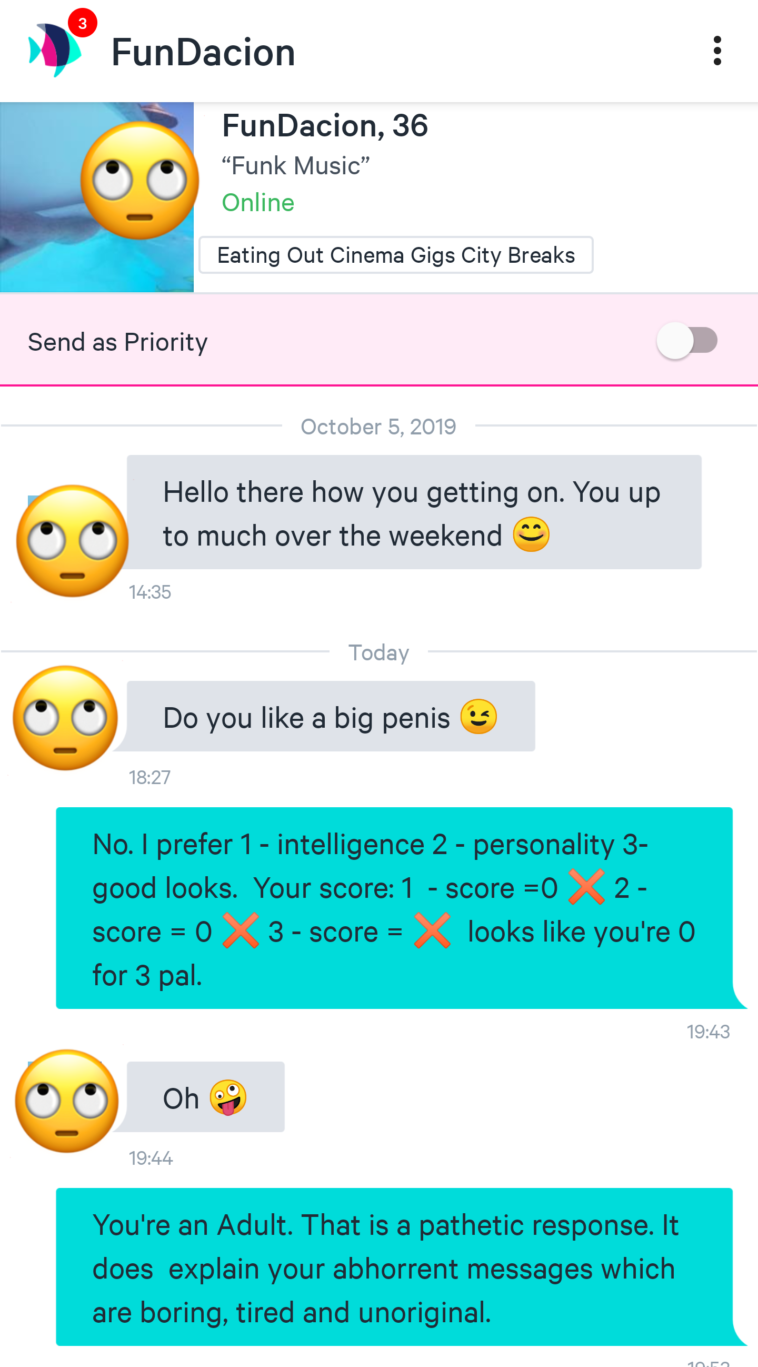 I’m older than he is, and I think that’s a great idea. But I only have two inches of terror. So, I can’t use that one. I have to talk about how long my tongue is. Or about how ya don’t need « talent » when ya have skill. Or you could lighten up, and not take it so fucking serious, that’s why they call it dating