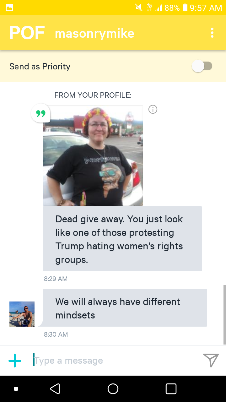 I had a woman ask me my thoughts in feminism once. I asked her her thoughts on flat vs round earth. I like to know where someone stands before meeting them.