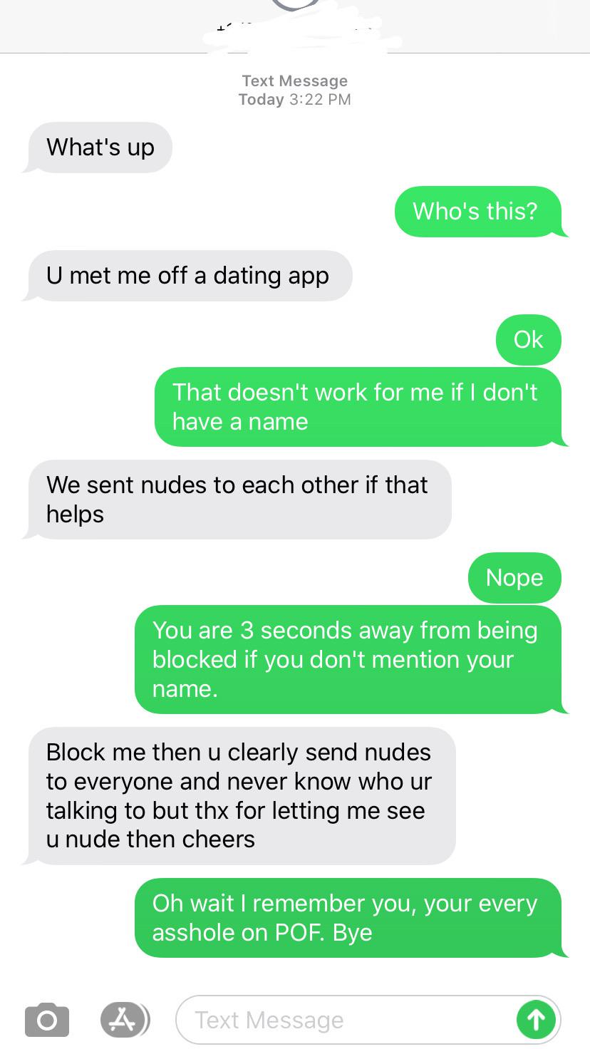 POF : Sure don’t tell me your name, also I don’t send nudes. So your just a dick.