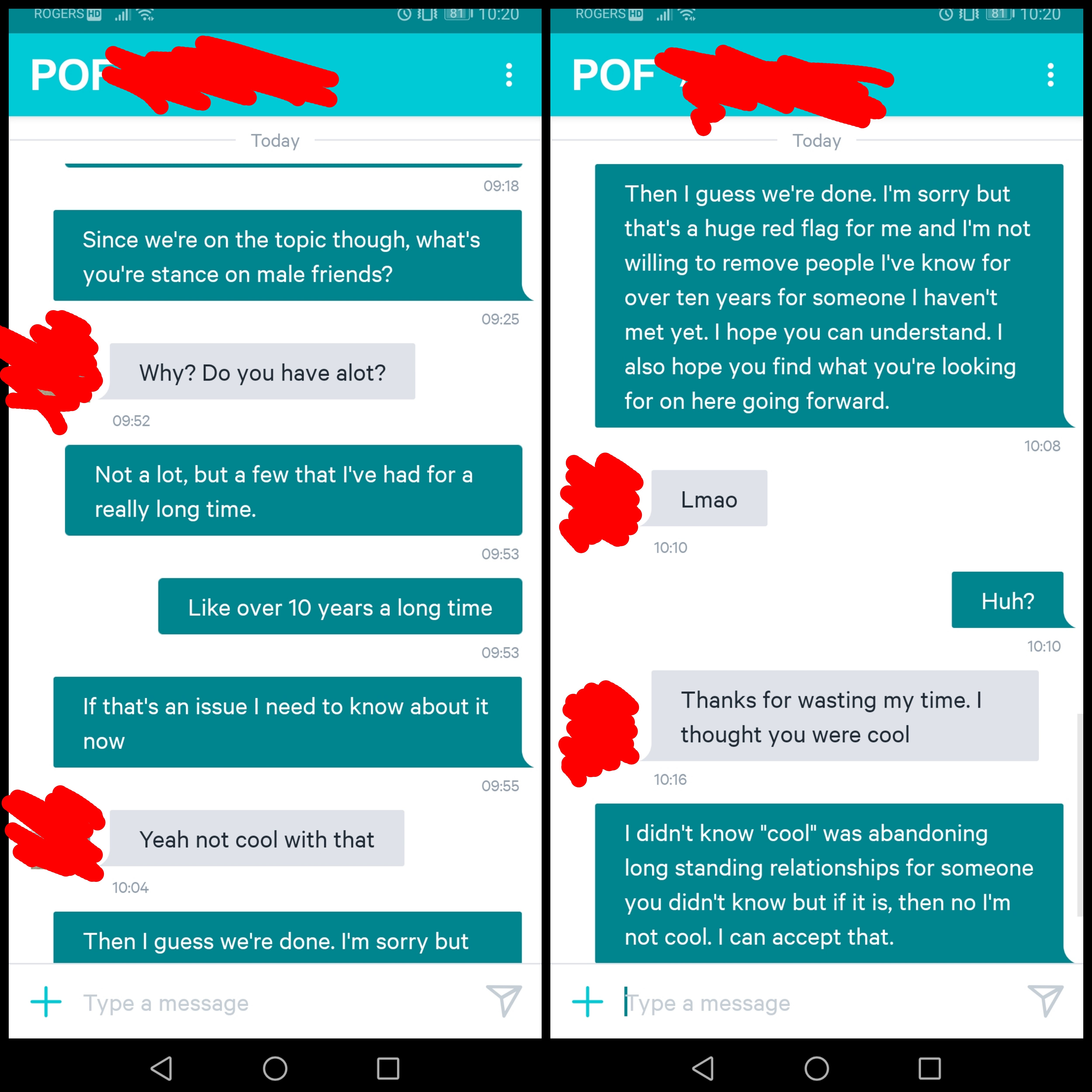 POF : Talked for a week, never met but had a date planned. Came out that apparently if I even know another man that’s not « cool »… Left the site after this.