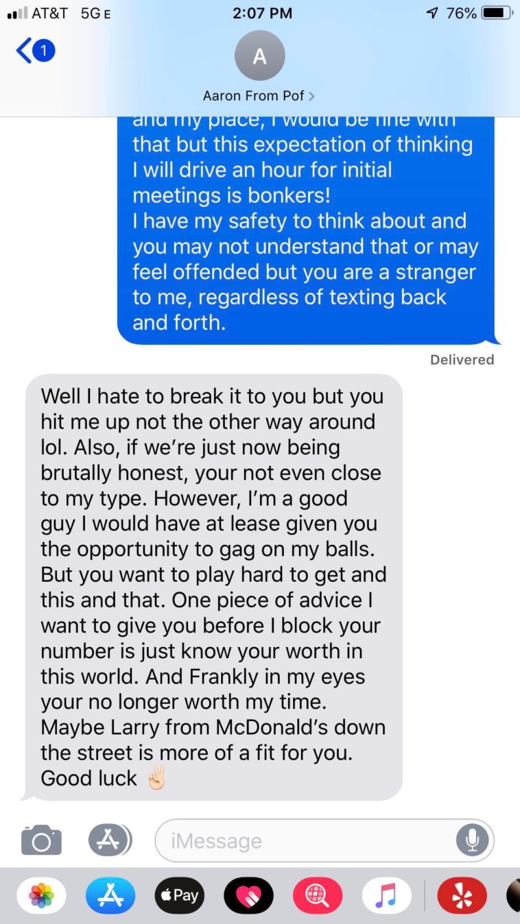 POF : Told a guy I exchanged numbers with that I wasn’t willing to drive over an hour for a first meeting and oh is he butt hurt over my rejection. Mind you I did say if we met half way I wouldn’t have an issue meeting. Regardless of if I messaged someone first, I was never asking for a booty call