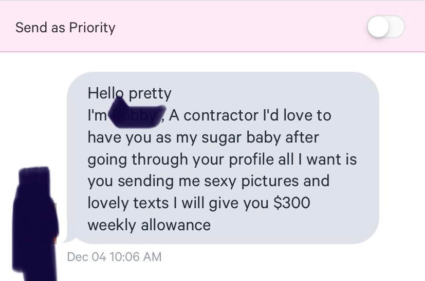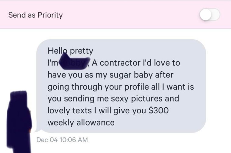 Lol I got an offer to be someone’s sugar baby with no sex involved today. Pass, I never believe them anyway. I’m sure if they were serious enough they’d use the websites geared for it.