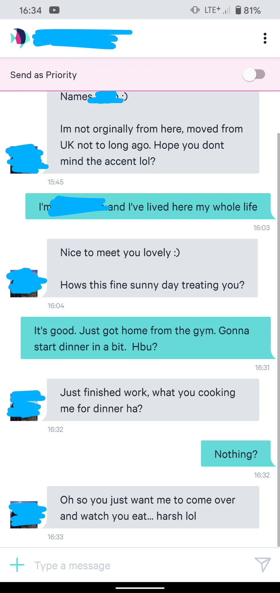 I’d already be bugged by his nonexistent apostrophe use before we even got to the hypothetical meeting up after exchanging three sentences.