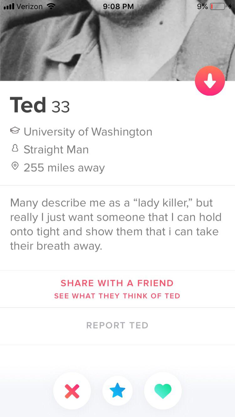 Tinder : A friend spotted this profile while swiping in Seattle. Yes, the photo is Ted Bundy.