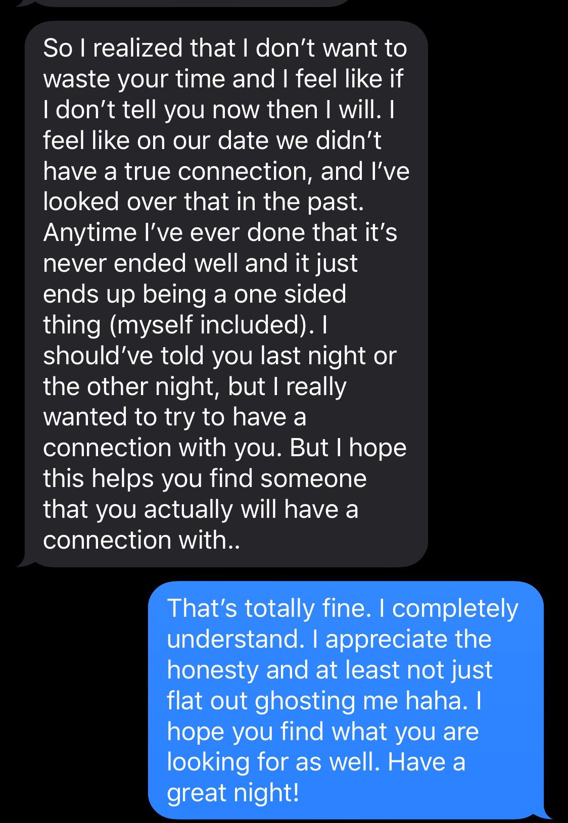 I’m a fan of not ghosting but I do have one slight problem with her text, the “true connection.” Far too often I’ve dealt with or heard of people expecting to feel something, that “true connection”, that generally comes with time and experience with an individual. Though she could just be using that a a general term, idk