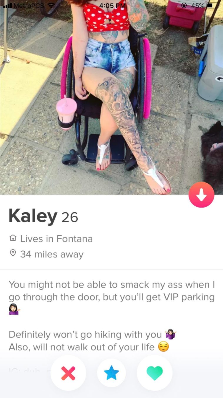 Hahaha this is my tinder profile. These comments are great. For the record, I am paralyzed. I’ve been a quadriplegic for 12 years from a car accident.