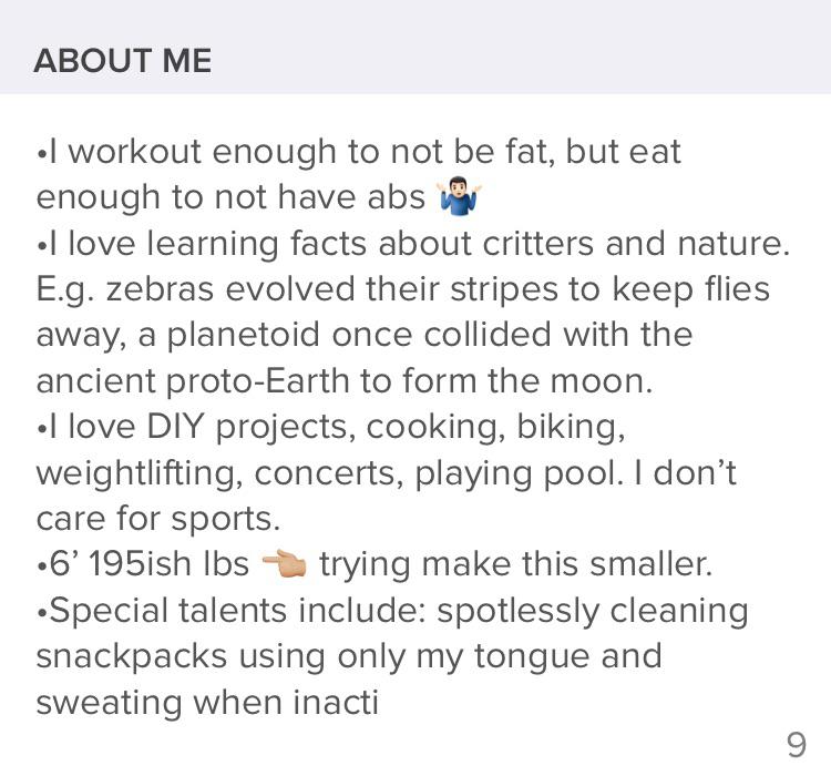 Ayyy can I get an opinion on my bio? Hopefully it make up for my garbage selfie skills. 28M