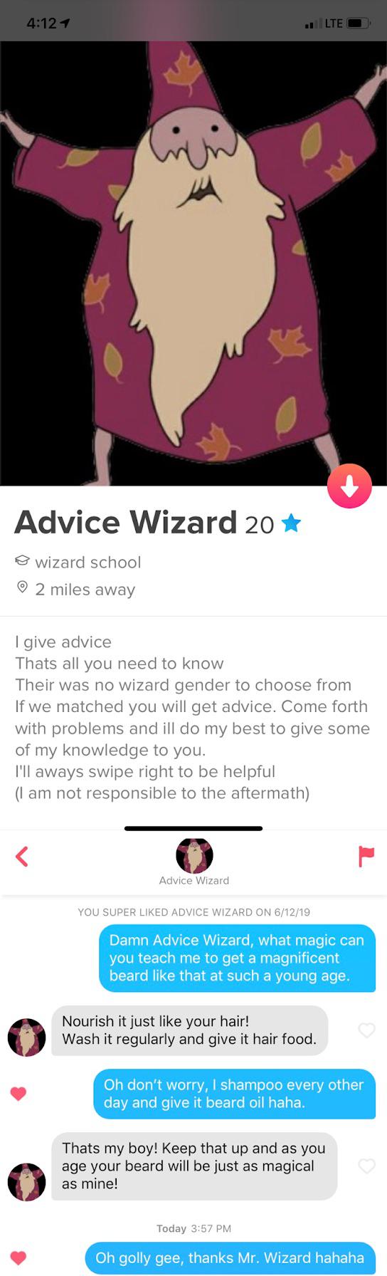 Tinder : Behold the Advice Wizard, bio made me chuckle.