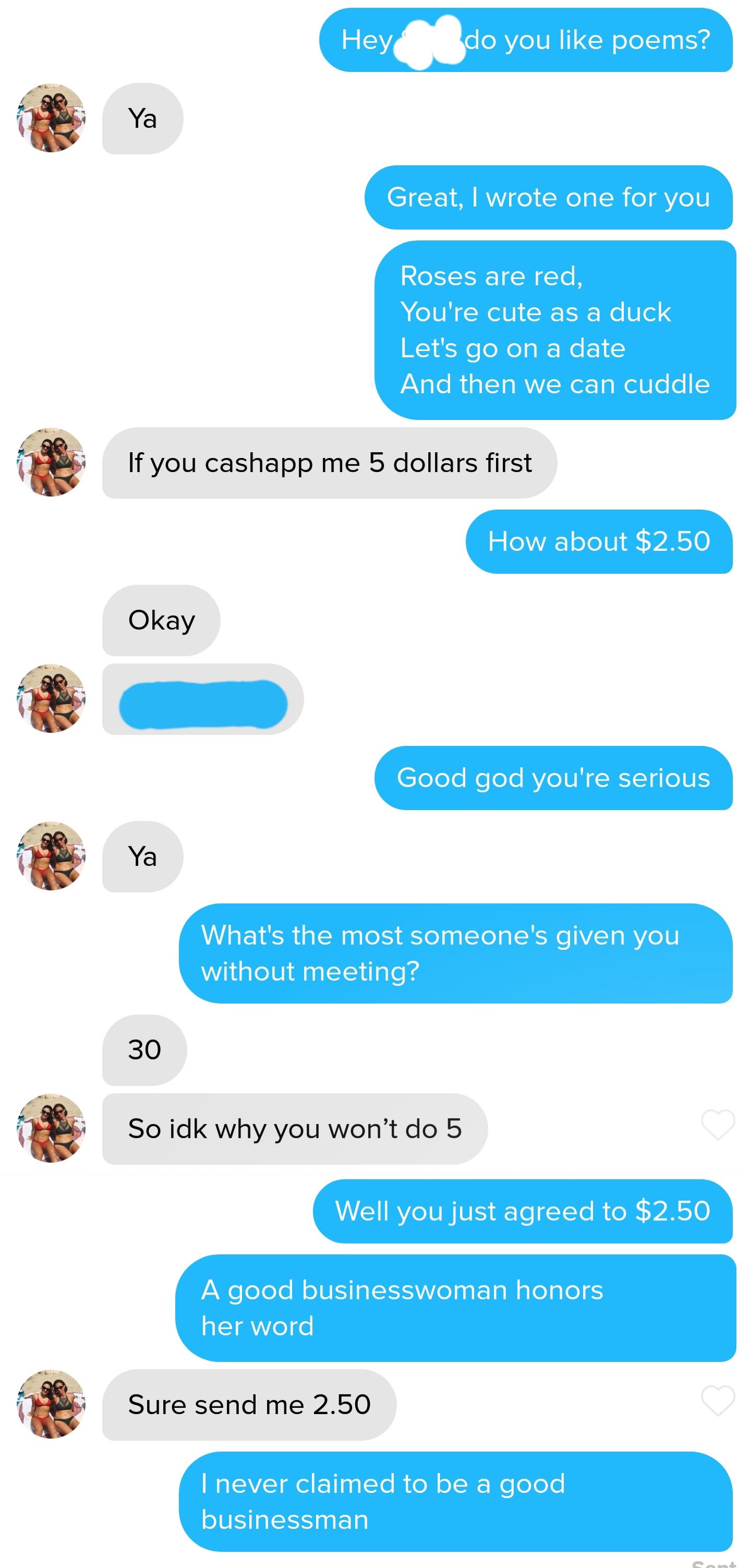 4. Is she (these types of ppl) asking for money for the sole purpose of asking for money, b/c she has a chance of getting it as a female or is there subtext that this a fee for some service to be named later…?