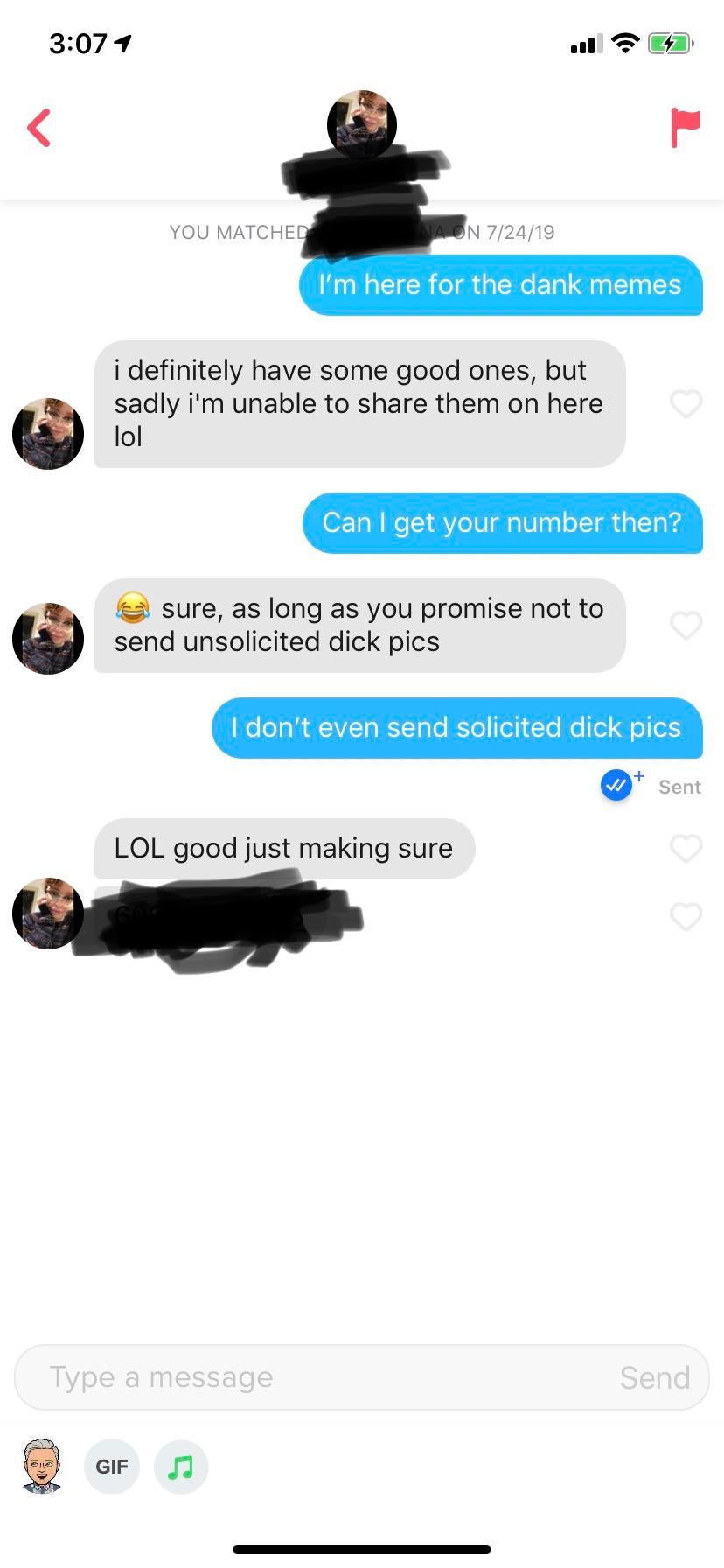 I always send unsolicited Dickpics. As in pictures of Dick Cheney. I always get a confused response tho.