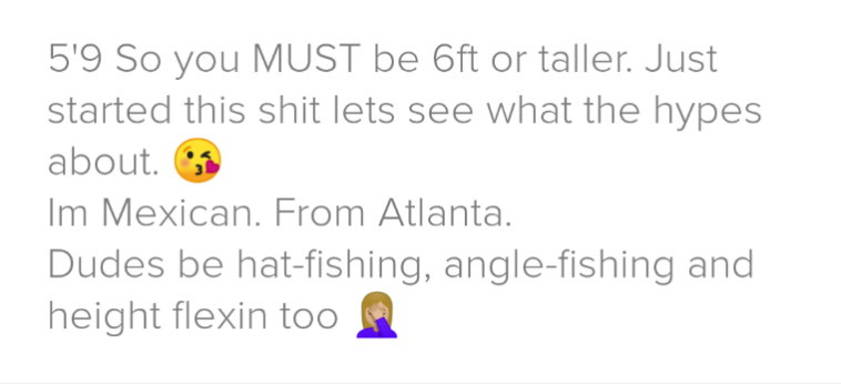 Tinder : Doesn’t like guys who talk about their height, but has a height requirement. Hmm…