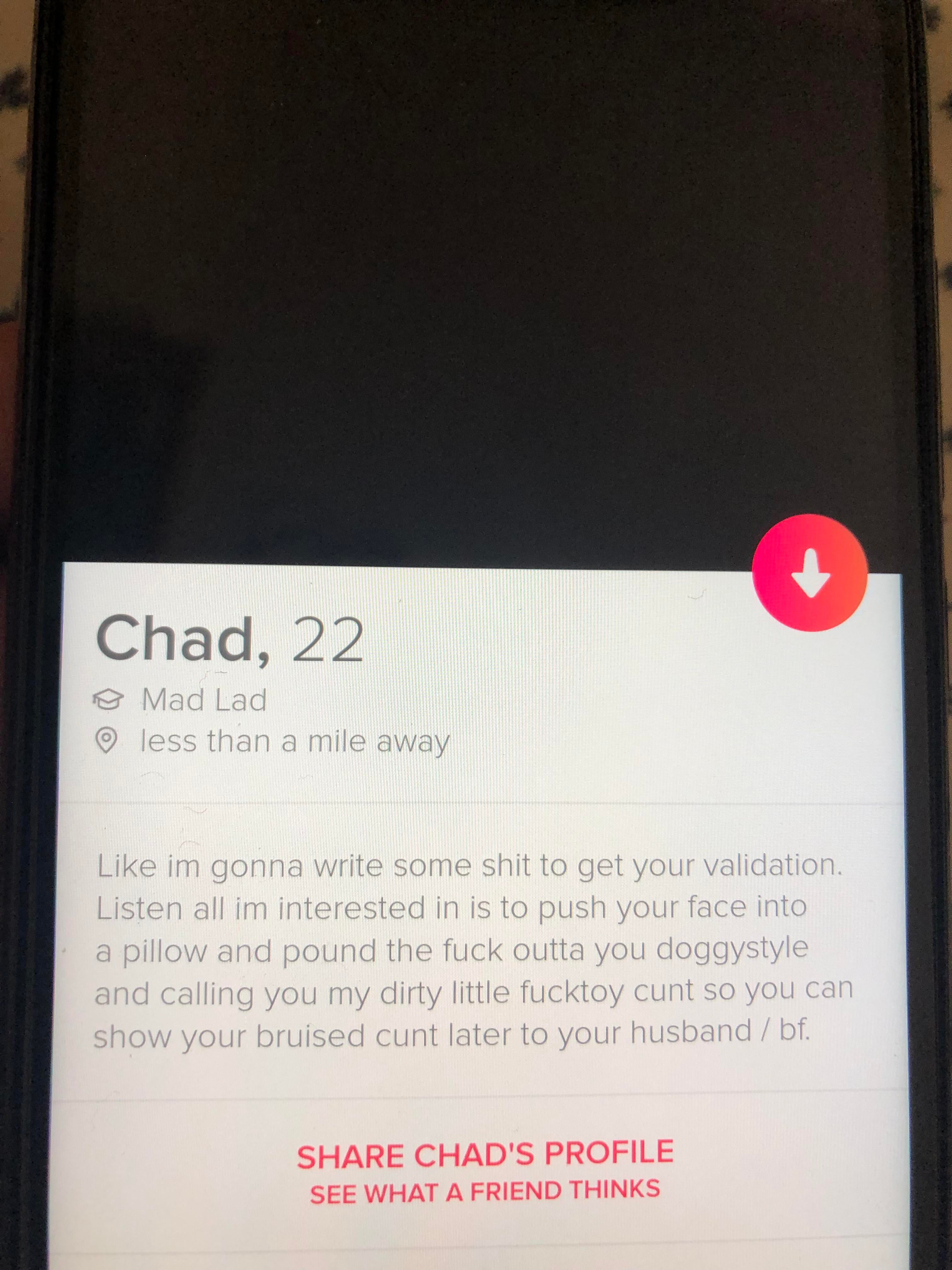Tinder : found on my friends tinder. had us both laughing at this guy who’s confident he could “pound the fuck” outta her when he can’t even put up a photo 😂