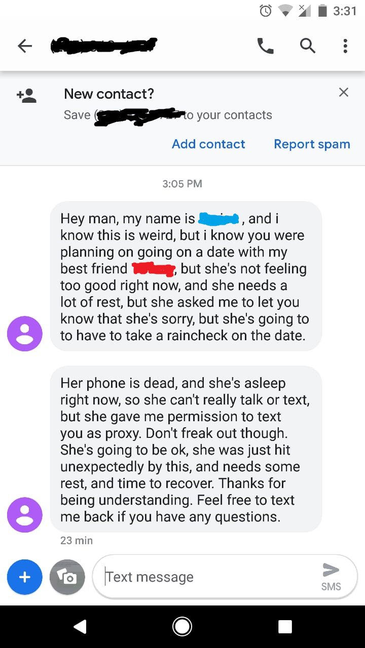 Friend wanted to hang with the girl. Girl said she had date. Friend said screw the date. Girl said yeah I’m not dying to go… But i can’t just cancel. Friend said – gimme his number, I’ll take care of it.