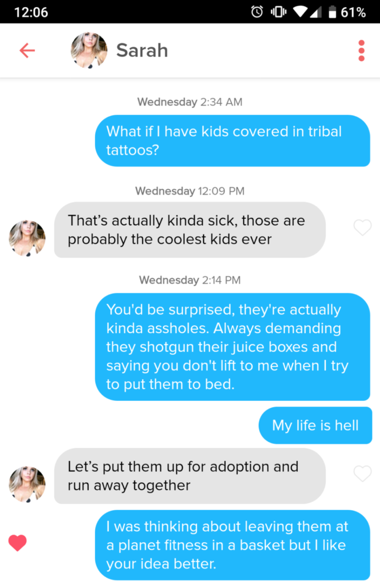 Tinder : Her profile said no kids or tribal tattoos
