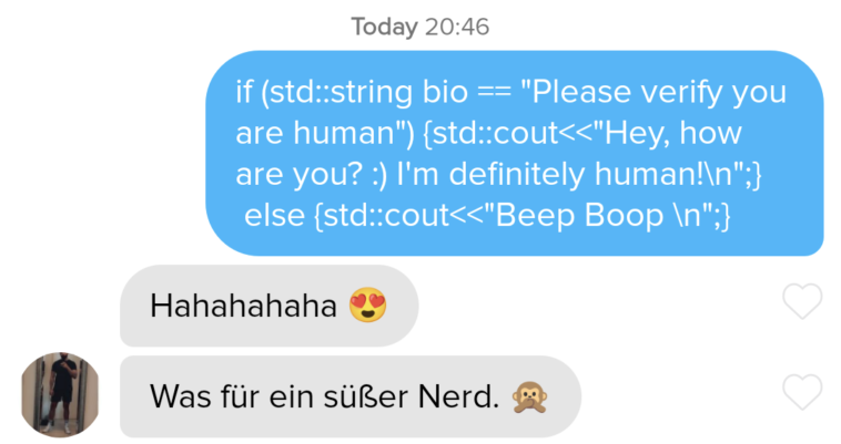 His bio said « please confirm you are human ». Can’t believe my cringey ass message worked