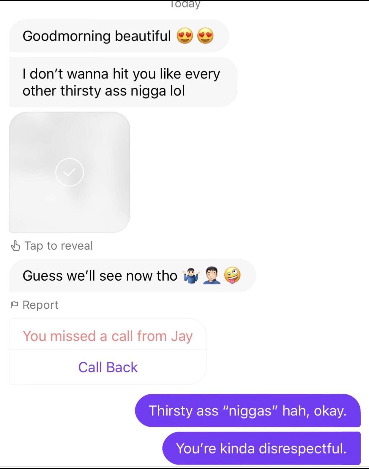 Tinder : How… disturbing. (I’m black btw.) And this was a white man. Saying the N word to me. 🤔