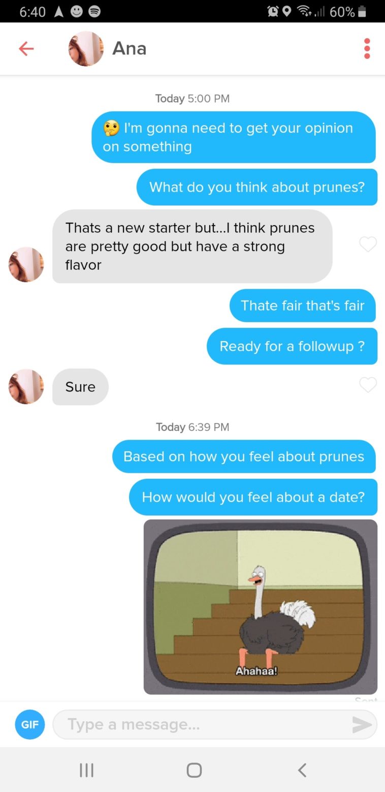 Tinder : How do you feel about prunes?