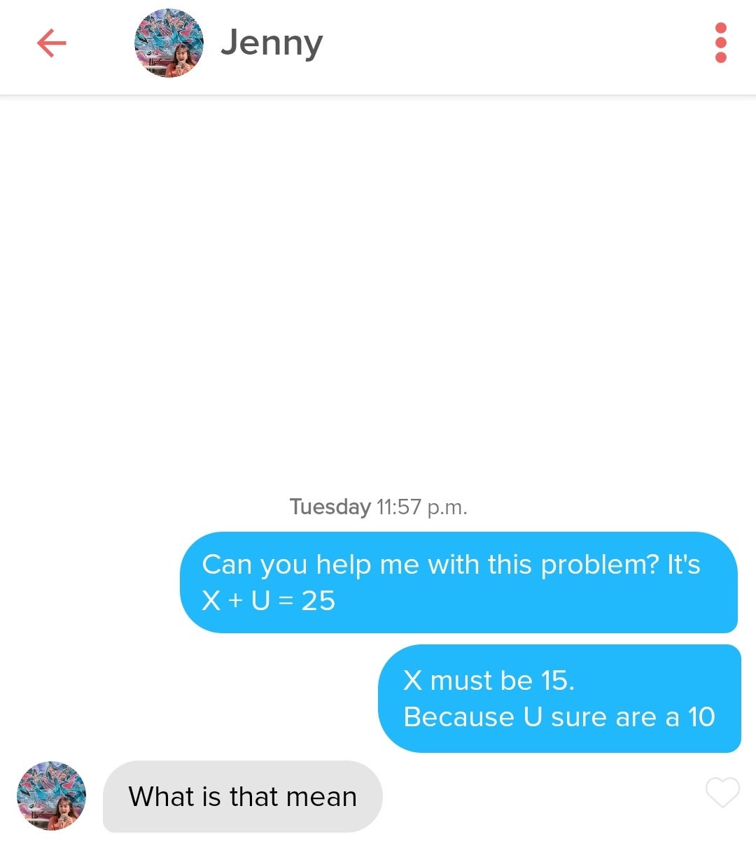 Okay hear me out here. You were trying to call her a 10 by saying that the variable U was equal to 10 and implying a « you/U » connection. But your other variable was X. So while you’re calling her a 10, you’re telling her your ex was a 15.